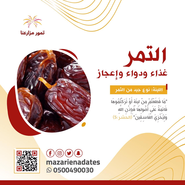 نبات التمر ومتاجر التمر زورو متجرنا للتعرف على كل المنتجات والانواع متجر تمور مزارعنا https://i.suar.me/aa1XO/l ما هو التمر ؟؟ • شجرة كبيرة غير متفرعة • الأوراق متجمعة في القمة • الورقة عبارة عن 'سعفة' تحمل وريقات صغيرة تدعى 'الخوص' وهي حادة النهايات • يوجد على حواف الورقة أشواك طويلة حادة • الأزهار المذكرة والمؤنثة تحمل على نباتات مختلفة • الثمار بيضوية أو شبه دائرية تحمل في داخليها بذرة واحدة كبيرة تاريخ نبات التمر • عرفت شجرة نخيل التمر قبل ميلاد المسيح عليه السلام بعدة آلاف من السنين • من المعروف بأنها كانت شجرة مهمة لدى المصريين القدماء • قد زرعوا أشجارها في الحدائق والمقابر والقصور، وصنعوا من أليافها وسعفها ملبوسات وأدوات مختلفة • كان المصريين يحملون سعف النخيل في مواكبهم الجنائزية • استخدم البابليون التمر في عمل لبخات لعلاج الجروح والكدمات والأمراض الجلدية • انتقل التمر إلى سوريا، حيث أخذه الفينيقيون، ونشروه في مناطق أخرى من العالم، خصوصاً المنطقة الجنوبية من المتوسط، وقد أسمي نسبة لهم بالاسم العلمي للجنس 'Phoenix' • كانت ثمار نخيل التمر، تستخدم في الطب العربي لعلاج مجموعة واسعة من الأمراض الصدرية والبلغمية https://i.suar.me/L08w6/l المواد الفعالة في التمر • تحتوي ثمار التمر على مجموعة كبيرة من الأملاح المعدنية خصوصاً الحديد والنحاس • كما تحتوي على الفيتامينات والكربوهيدرات وبعض الدهون والبروتينات • لذا فإنها تؤثر على الجهاز المناعي والجهاز العصبي تأثيرات مدهشة، وتعتبر غذاء كاملاً كم تحتوي التمور على سعرات حرارية؟ يمكن أن يساعد المستوى العالي من الألياف في التمور على تنظيم السكر في الدم، تخفيف الإمساك، والحد من مستوى الكولسترول السيء في الدم. أما بالنسبة للأناس الذين يتطلعون إلى تعديل استهلاكهم من الكربوهيدرات، أو المرضى المصابين بالسكري، فقد لا تكون استهلاك التمور بكمية عالية الخيار الأفضل بالنسبة لهم. حيث تعتبر التمور غنية بالكربوهيدرات والسكريات البسيطة وذات مؤشر غلايسيمي عالي مما يرفع نسبة السكر في الدم بشكل سريع. على الرغم من الفوائد الصحية للتمر، إلا أنه إذا كنت تتبع نظام غذائي منخفض السعرات االحرارية لمحاولة إنقاص الوزن أو لغيرها من الأسباب، فإن تناول التمر بكميات كبيرة لا يعتبر خياراً جيداً بالنسبة لك، لأن التمور تعتبر عالية بالسعرات الحرارية. وتختلف كمية السعرات الحرارية في التمور باختلاف أنواعها، وما يلي السعرات الحرارية لأهم أنواع التمور: • تحتوي حبة واحدة من تمر المجدول على ما يقارب ستة وستون سعرة حرارية. • تحتوي حبة واحدة من تمر البتيل على ما يقارب عشرون سعرة حرارية. • تحتوي أونصة واحدة من تمر الحمراء على ما يقارب واحد وخمسون سعرة حرارية. • تحتوي حبة واحدة من تمر دقلة النور على ما يقارب عشرون سعرة حرارية. • تحتوي أونصة واحدة من التمر المجفف على ما يقارب ثمانون سعرة حرارية. • تحتوي حبة واحدة من تمر المجدول على ما يقارب ستة وستون سعرة حرارية. • تحتوي حبة واحدة من تمر العجوة على ما يقارب خمسون سعرة حرارية. • تحتوي قطعة متوسطة الحجم من معمول التمر على ما يقارب مائتان وخمس وثمانون سعرة حرارية. القيمة الغذائية في التمر يوجد العديد من أنواع التمر، حيث تختلف القيم الغذائية للتمر باختلاف أنواعه، ويعتبر تمر دقلة النور والتمر المجدول من أشهر هذه الأنواع. القيمة الغذائية في تمر دقلة النور تحتوي الحصة (100 جرام أو 14 حبة تقريبا) من تمر دقلة النور على: • 282 سعرة حرارية • 2.5 جرام من البروتين • أقل من نصف جرام من الدهون • 75 جرام نشويات منها تقريبا 63.4 جرام سكر (يضم أنواع السكر البسيطة مثل السكروز والفركتوز والجلوكوز) • تحتوي الحبة الواحدة على نصف جرام من الألياف • تحتوي الحصة على 8 جرام من الألياف تحتوي الحصة من تمر دقلة النور على 19% من الحصة اليومية اللازمة للجسم من البوتاسيوم، و 11% من المغنيسيوم، و 8% من فيتامين ب-6، و 5% من حمض الفوليك، و 6% من الحديد، و 4% من ال