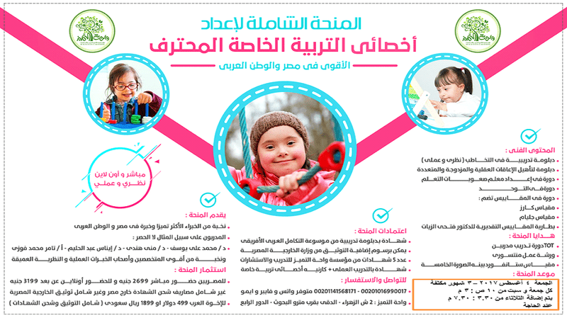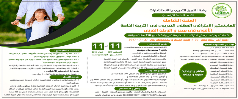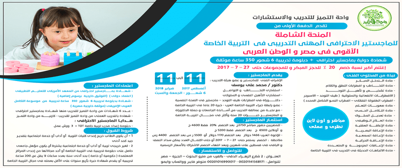 الماجستير التدريبى الاحترافى فى التربية الخاصة 11 أغسطس 2017 انضم للمتميزين و النخب فى التربية الخاصة .... فى المــــاجستير المهـنى التدريبى الاحــترافى فى الــتربية الخـاصة الأقوى و الأضخم فى مصر و الوطن العربى حصـريا.. مؤسسة واحـــة التمــيز للتدريب مصر .. ( مبـــاشر و أونــلاين ) ( عمــلى و نظـــرى ) 🎁 🎁*ما زال الخصم 20 % مستمر حتى الخميس القادم 3 - 8 - 2017 م الماجستير التدريبى بيضم 7 دبلومات تدريبية كاملة متكاملة : ( منها دبلومة التخاطب - دبلومة التوحد - دبلومة العلاج الوظيفى - دبلومة تعديل السلوك - دبلومة الإعاقات المتعددة و المزدوجة - و دبلومة صعوبات التعلم - دبلومة الإعاقة العقلية و التدخل المبكر ) و ده غير 8 مــــواد تانية منهم 5 مواد متخصصة فى التربية الخاصة وبعمق و ليس قشور .... على أيدى نخبة من أقوى المتخصصين أصحاب الخبرات العملية الكبيرة فوق 20 عاما من الخبرة صعب المقارنة فى التمكن والخبرات و بشهادة دولية واحدة بمسمى ماجستير احترافى+ شهادة بدبلومة تدريبية 6 شهور موثقة خارجية مصرية بعدد ساعات 350 ساعة ) ) عدد 7 شهادات من واحة التميز مصر و كارنيه التدريب أيام الجمعة والسبت من كل أسبوع مع إضافة يوم ثالث عن الحاجة 🎁 🎁*يمكن التقسيط حتى 3 شهور يعنى سى فى كامل و جديد و قوى جدا أنت درست و اتدربت على أكثر من 15 مادة فى الماستر فقط *و التخصص فى واحد من أربعة تخصصات : التــوحد - التخـــــاطب واضطرابات النطق و الكلام م - الإعــــــاقة العقليـــــــــة - صعــــــــوبات التعلـــــــــــم .. 🎁 🎁* https://i.suar.me/QGAgp/m الاستثمــــــار حتى نهاية الخصم : ***************************** للمصريين حضور مباشر 5750 ج بعد الخصم 20% فقط 4600 ج و أونلاين 6500 ج بعد الخصم فقط 52000 ج للإخوة العـــــرب 1466 دولار بعد الخصم 1170 دولار أو 5500 ر س بعد الخصم 44000 رس ✔ ✔ ✔*استمارة التسجيل لسهولة التواصل مع الجادين فى الاشتراك برجاء ملء على الرابط التالى : YLwuk البيدج الرئيسى لواحة التميز للتدريب و يمكنكم التواصل معنا مباشرة على الرابط التالى : mUTXD رابط الإيفنت الماجستير المهنى التدريبى فى التربية الخاصة لمزيد من المعلومات : hPc7l رابط ايفنت المنحة الشاملة لإعداد أخصائى التربية الخاصة المحترف 4 - 8 - 2017 : 6aktY https://i.suar.me/BjZlr/m ✔ ✔ ✔*العنـــــوان : 2 شارع الزهراء الدقى - بالقرب من مترو البحوث – الجيزة – مصر ✔ ✔ ✔*للتواصل : 00201141568171 - 00201016990017 متوفر فايبر وواتساب وايمو 🎀 🎀 🎻و 🎻* عمالقة التــربية الخـاصة من أساتذة الجـامعات و حملـة الدكتــــوراة و المــــاجستير و خبرات معظمها فوق 20 عاما من العملى يعنى بتأخذ خبرات و مهارات تشغلك 🔥* 🔥 🔥*ده غيــر مفـــاجآت أخرى بيتم ( سيتم الإعلان عنها وقت التدريب مباشرة ومستويات متقدمة للمتفوقين فى الدراسة و التدريب ) . 📚 📚 📚*ماجستير احترافى هتعيش حياة البحث العلمى المقــــنن و المعتبر مع التدريب العملى و الخبرات العميقة ، و فيه تعمل أبحاث فى تخصص من التخصصات اللى هتتحددلك ، و أنشطة تطور تخصصك وحياتك ، منها بحــــث يتم نشــــــره فى إحدى المجلات الدولية فى مجال التربية (باسمـــــــك ) 🍬 🍬 🍬*تدريب عملـــــــى فى مستشفيات دولية و مـــــراكز كبـــــرى متخخصة على يد نخبة من أقوى المتخصصين فى التربية الخاصة 📚 📚 📚*الإشــراف الفنــى للماجسـتير المهنى و عضو هيئة التدريب : ****************************************************** *دكتــــــــور / محمـــــد علـــــــى يـــــــوســــــف استشارى التخاطب و التواصل – استشارى التأهيل النفسى و السلوكى – *دكتــــــــوراة فى اضطرابات طيف التوحد – ماجستير فى الصحة النفسية - عضو رابطة خبراء التربية الخاصة العرب – عضو رابطة خبراء التربية الخاصة العرب –عضو الجمعية الأمريكية للتخاطب – عضو اللجنة العلمية لوضع معايير الجودة للعمل مع ذوى الاحتياجات الخاصة . خبرة 20 عاما فى مجال التربية الخاصة و التدريب الدولى فى كبرى الجامعات المصرية ، ونخـــبة من عمـــــالقة الـــتدريب و هيئـــــة التــــدريب المشاركين 