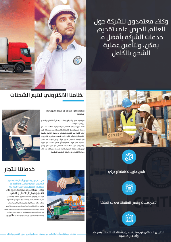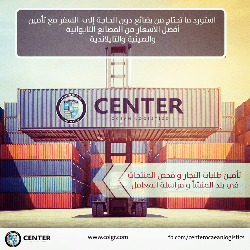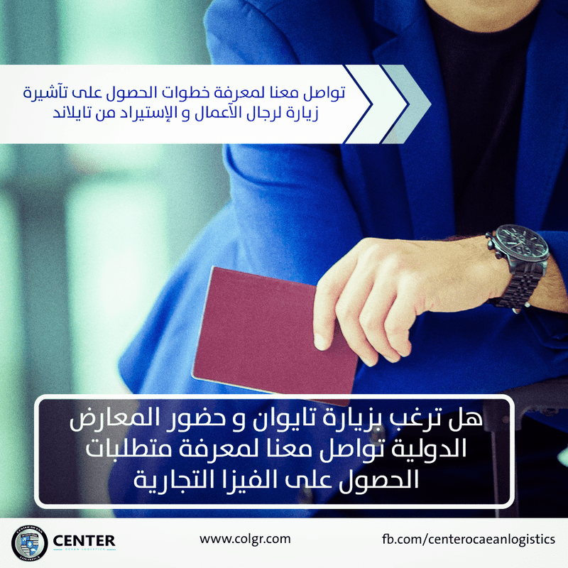 هل تريد زيارة تايوان و التجارة مع الصين ؟ هل ترغب بأستيراد بضائع من تايلاند ؟ نحن نؤمن لك الفيزا التجارية لزيارة المعارض و المصانع في تايوان ..من وصولك للمطار و حتى وصول بضائعك لبلدك .. لمشاهدة فيديو تفصيلي عن خدمات الشركة يرجى الضغط على رابط الفيديو في اسفل الصفحة https://www.facebook.com/centeroceanlogistics/ تعد شركة سنتر اوشن واحدة من أفضل شركات الشحن والنقل الدولي في العالم، //نقل بري، نقل بحري، نقل جوي//، مركز الشركة الرئيسي موجود في تايوان، الصين وتايلاند وممتد بشبكة واسعه حول العالم لتسهيل وتأمين عملية الشحن، كما ويوجد مستودعات تخزين للشركة في العديد من البلدان حيث يتم حفظ وتخزين حاوياتك الى حين نقلها. خدمات شركة سنتر اوشن تغطي كلفة بلدان العالم تقريبا وعلى وجه التخصيص، تايوان، الصين، دبي، المانيا، سوريا، الخليج العربي (السعودية، الامارات، البحرين، قطر، الكويت، سلطنة عمان)، الأردن، العراق، مصر ولبنان. - لمعرفة آحدث العروض و آسعار نقل الحاويات تواصل معنا اليوم* [email protected] _ جاهزون للرد على استفسارتكم من خلال زيارة موقعنا او البريد الإلكتروني*ّ whatsapp : +886908909000 _ نساعدك و آنت في بلدك ..استورد كل ما تحتاجه من تايوان و آبدأ اعمالك التجارية بكل تمييز عن الآخرين . _ تواصل معنا لمعرفة خطوات الحصول على تآشيرة زيارة لرجال الآعمال و الإستيراد من تايلاند* نحن في شركة سنتر اوشن لوجيستك قادرون على تامين تواصل مستمر مع العميل لمتابعة تفاصيل عملية الشحن بشكل دقيق، مما يجنّبك من استخدام تدخلات الوسطاء او المترجمين في بلد المنتج الأصل. تقدم شركة سنتر اوشن لوجيستك ميزة لعملائها وخاصة من رجال الاعمال او كبار التجار الذين يودون متابعة تفاصيل عملية الشحن وشراء البضائع بانفسهم , او حتى لو أرادو السفر مباشرة لتايوان لتفقد المصانع قبل شرائها فان شركة سنتر اوشن لوجيستك فتحت الطريق أمامهم وأتاحت لهم عملية المتابعة أو السفر لبلد المنشأ بكل سهولة حيث أنها تقوم بتنظيم عملية السفر لتايوان وتقديم المساعدة الازمة للحصول على الفيزا التجارية وتقوم بخدمة التاجر من المطار, وتقوم بجدولة وتنظيم مواعيد المعامل حسب مواعيد رحلة السفر الخاصة بالمستورد ليتمكن من القاء نظرة على صناعة المنتج بشكل مباشر, كما وان الشركة تقوم بتقييم الأسعار في تايوان وتقدم للبائع ما يناسبه وتزوده بالعناوين وكل ما يحتاج اليه خلال رحلته تعقب حركة حاوية بضائعك ولاحق طلباتك عبر شبكة الانترنت بكل سهولة: مع شركة سنتر اوشن، لن تحتاج أبدا للقلق والتفكير اين هي حمولتك !ومواعيد وصولها. نظام تتبع الحاويات العالمي لدينا سيبقيك متطلعا على اخر وأحدث اخبار وتفاصيل الشحنة لحظة بلحظة. مما يسمح لك لتتبع أوامر الشراء من المصانع في الصين او تايوان وعبر الإنترنت باستخدام هاتفك النقال فقط ،تستطيع تفقد بوليصة الشحن، أو أرقام أمر الشراء. تأكيد التسليم عبر البريد الإلكتروني في الوقت الحقيقي! تخيل فوائد توفير الوقت عند تلقي التسليم في الوقت الحقيقي أو إشعار استثناء عبر البريد الإلكتروني مجرد لحظات بعد الاستلام. مع شركة سنتر اوشن لوجيستك، يمكنك الحصول كافة معلومات حمولتك من خلال بريدك الالكتروني في الوقت الحقيقي لتسلمها. تفحص المنتج بشكل دقيق ليس فقط للتأكد من مطابقتها للمواصفات، ولكن أيضا لتأكيد قدرتها على تحمل عملية الشحن او النقل، حتى يستلمها التاجر بنفس الحالة التي أرسلت فيها من بلد المنشأ. اتصل بنا للاستفسار عن أفضل الاسعار المتاحة لدينا حيث يوجد عقود متنوعة مع أكثر من عشرة خطوط ملاحية جوية وبحرية عالمية ووكلاء شحن على مستوى العالم تعلمكم الشركة بتوفير الخدمات التالية شحن حاويات من أوروبا الى سوريا مباشر أو عن طريق لبنان والامارات شحن جزئي بحرا وحاويات من الصين وتايوان وكوريا الى سوريا مباشر وجميع الدول العربيه شحن جزئي بحرا وحاويات من الامارات الى سوريا وجميع الدول العربيه شحن جوي من الصين والامارات الى سوريا وجميع الدول العربيه تخليص جمركي ب