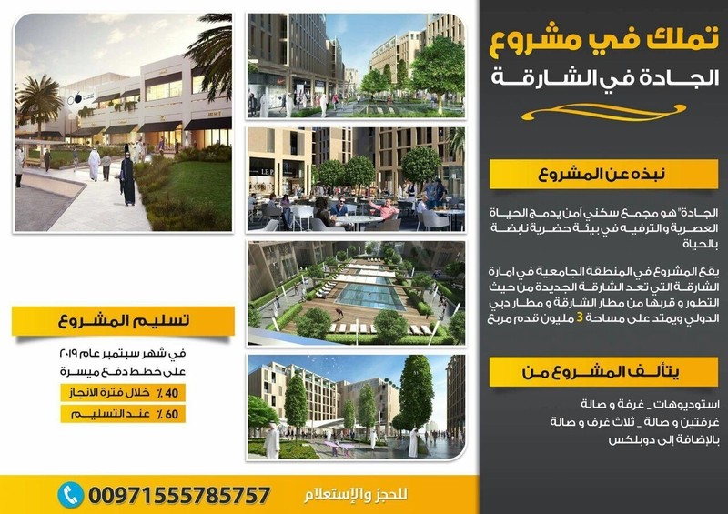 https://i.suar.me/ZYAjg/m سارع بتملك شقتك في مشروع الجادة بالشارقة من شركة أراد للتطوير العقاري وبالتقسيط المريح للاستعلام والاتصال او واتس اب : 00971555785757 تحت رعاية وحضور صاحب السمو الشيخ سلطان بن محمد القاسمي عضو المجلس الأعلى حاكم الشارقة . تم بحمد الله إطلاق الواجهة الجديدة العصرية للشارقة في منطقة الشارقة الجديدة ( مشروع الجادة العقاري )* يتضمن المشروع إطلاق شقق سكنية* ستوديو غرفة وصالة* غرفتين وصالة* ثلاث غرف وصالة* وفلل وتاون هاوس من غرفتين وثلاث غرف * خطط دفع ميسرة تبدأ من ١٠٪ فقط مع إمكانية التمويل البنكي بالشراكة مع مصرف الشارقة الاسلامي* نبذة عن المشروع: الجادة" هو مجمع سكني آمن يدمج الحياة العصرية ووالترفيه في بيئة حضرية نابضة بالحياة. يقع المشروع في المنطقة الجامعية في امارة الشارقة التي تعد الشارقة الجديدة من حيث التطور و قربها من مطار الشارقة و مطار دبي الدولي ويمتد على مساحة 3 مليون قدم مربع. يضم المشروع خدمات ترفيهية و ثقافية(مقاهي، مطاعم، ممشى، نوادي صحية، حدائق و حضانة للأطفال) .* يتألف المشروع من استوديوهات، غرفة و صالة، غرفتين و صالة، ثلاث غرف و صالة ، بالضافة الى دوبلكس.* تسليم المشروع سيكون في شهر سبتمبر عام 2019 * و على خطط دفع ميسرة 30% خلال فترة الانجاز و 70% عند التسليم مع إمكانية التمويل عن طريق بنك مصرف الشارقة الاسلامي دراسة المشروع:* المشروع هو من أهم المشاريع الاستثمارية في المنطقة *حيث يقع في المنطقة الجامعية التي تضم 30000 طالب و معلم و مقابل ثاني أكبر ستي سنتر في الامارات الذي سيضم 10000 موظف ما يزيد الطلب على الشقق السكنية الفاخرة في هذا الموقع. ويعتبر مشروع الجادة في الشارقة مشروعا مشتركا بين رئيس مجلس إدارة KBW للاستثمارات الأمير خالد بن الوليد بن طلال، ورئيس مجلس إدارة مجموعة بسمة الشارقة "بسمة" الشيخ سلطان بن أحمد القاسمي للاستعلام والاتصال او واتس اب : 00971555785757 |
