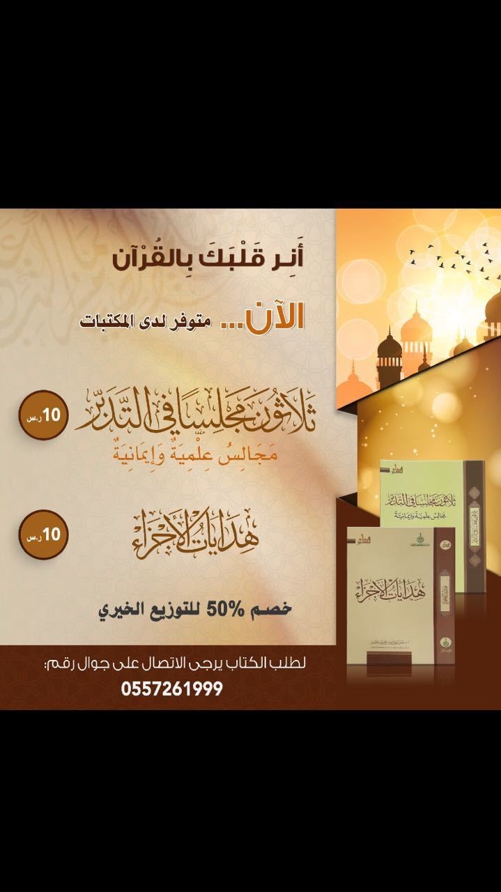https://i.suar.me/ly8E5/m بسم الله الرحمن الرحيم ((وما قدروا الله حق قدره إذ قالوا ما أنزل الله على بشر من شيء قل من أنزل الكتاب الذي جاء به موسى نورا وهدى للناس تجعلونه قراطيس تبدونها وتخفون كثيرا وعلمتم ما لم تعلموا أنتم ولا آباؤكم قل الله ثم ذرهم في خوضهم يلعبون)) (91) (الأنعام) إصدارات معالم تدبر الحديثه حاليًا في المكتبات. 1- كتاب: هدايات الأجزاء 2- كتاب: ثلاثون مجلساً في التدبر الآن فقط بـ (5 ريال) للتوزيع الخيري للاستفسار: 0557261999 https://twitter.com/bookstadabor https://i.suar.me/a8Lnz/m |