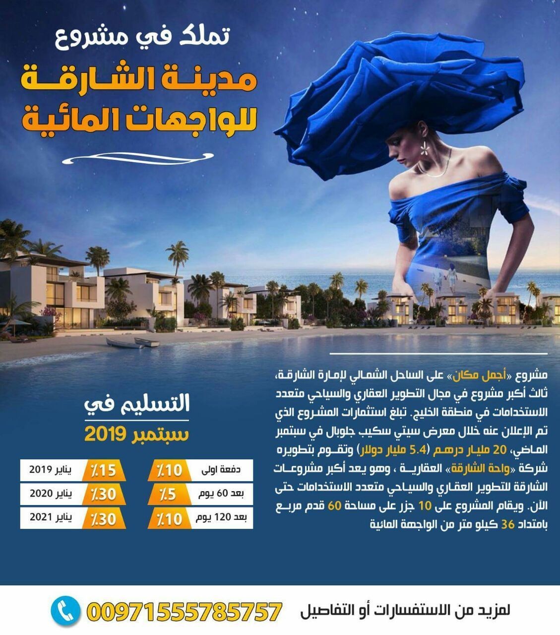 Sharjah Waterfront City AJMAL MAKAN https://i.suar.me/j8E4y/l Sharjah Waterfront City, built on the belief that the outside is as important as the inside is nestled amidst lush greenery. The city will be pollution free with world class facilities for elite living. With its beautiful beaches, moderate year long weather, leisure and shopping opportunities, Sharjah Waterfront City presents itself as a complete and attractive holiday destination for European and GCC families. Sharjah Waterfront City is designed to ensure the maximum comfort for the families, provided them privacy while enjoying the scenic beach view of the Sharjah Waterfront City view outside the villas and the apartments with beach, open spaces and greenery spread all around will be breathtaking. Sharjah Waterfront City is environment friendly and is based on hydro mechanic design, the project allows a natural dynamic movement of the sea water within its canals. The water is replenished every 12 hours depending on the sea tides movement, while the water canals dimensions that reaches up to 300 meters and depth of 5 meters guaranties the smooth natural water movement, which will provide the project with a distinctive waterfront with natural beauty. The project has 36 km of beautiful beaches, the green gardens the beaches and service areas make up 60% of the project area while buildings make up 40% only, which ensures the idea of building a healthy green society that respects nature and interacts with it positively. Sharjah Waterfront City will follow the international standards of green environment by building green buildings, which reduces energy use and reduces the overall carbon footprint of the project which will reflect in the comfort and benefit of the residents. Location Advantage SWFCITY is located in proximity from Hamriyah Free Zone, airport and other key attractions. Sharjah Waterfront City is easily accessible from the Ittihad Road, Emirates Bin Road and Mohammed Zayed Road. 00971555785757 تملك في مشروع «(فلل البحر) مدينة الشارقة للواجهات المائية» مشروع( فلل البحر ) «أجمل مكان» على الساحل الشمالي لإمارة الشارقة، ثالث أكبر مشروع في مجال التطوير العقاري والسياحي متعدد الاستخدامات في منطقة الخليج. تبلغ استثمارات المشروع الذي تم الإعلان عنه خلال معرض سيتي سكيب جلوبال في سبتمبر الماضي، 20 مليار درهم (5.4 مليار دولار) وتقوم بتطويره شركة «واحة الشارقة» العقارية، وهو يعد أكبر مشروعات الشارقة للتطوير العقاري والسياحي متعدد الاستخدامات حتى الآن. ويقام المشروع على 10 جزر على مساحة 60 قدم مربع بامتداد 36 كيلو متر من الواجهة المائية. لمزيد من الاستفسارات أو التفاصيل : 00971555785757 https://i.suar.me/dzEJz/l |