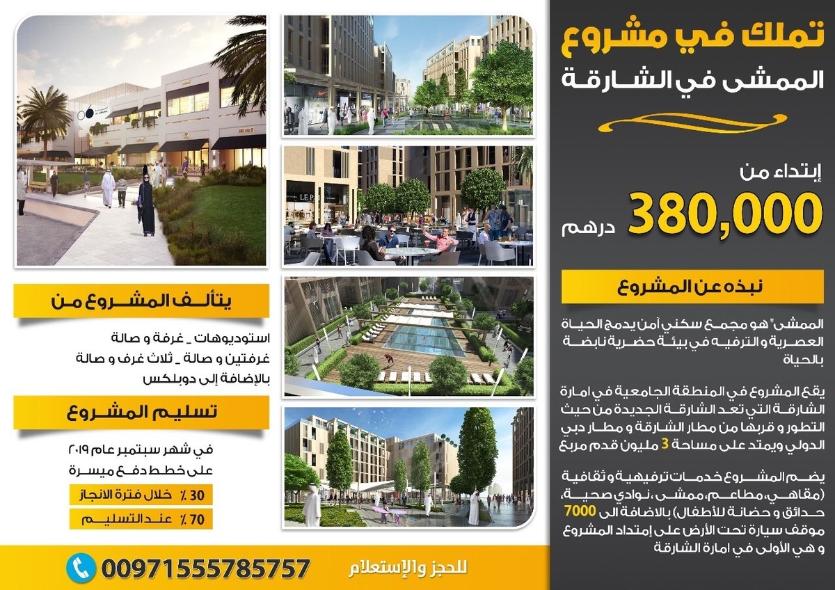 تملك شقتك في مشروع الممشى بالـشارقه ابتداء من 380 الف درهم فقط وبالتقسيط https://i.suar.me/qyleV/l للاستعلام والاتصال او واتس اب : 00971555785757 نبذة عن الشركة المطورة: مجموعة “ألف” Alef Group شركة تُعنى بتطوير مشاريع بإسلوب الحياة راقي، أسسها سمو الشيخ خالد بن سلطان القاسمي عام 2013. وتتخذ المجموعة من الشارقة، الإمارات العربية المتحدة مقرا لها وهي شركة رائدة في تطوير الوجهات والمنشآت الرائدة التي تقدم أرقى عناصر إسلوب الحياة العصرية من خلال الإستثمار وإقامة المشاريع الإستراتيجية المشتركة. تبلغ قيمة أصول المجموعة أربعة مليارات درهم إماراتي، وتبلغ قيمة الاراضي التابعة للمجموعة مليار درهم، وتقدم مجموعة “ألف” مشاريع بارزة وقيادية في قطاعات الأعمال والترفيه، تتكامل مع المجمعات السكنية النوعية التي تقوم المجموعة بإستحداثها. نبذة عن المشروع: "الممشى" هو مجمع سكني آمن يدمج الحياة العصرية والترفيه في بيئة حضرية نابضة بالحياة. يقع المشروع في المنطقة الجامعية في امارة الشارقة التي تعد الشارقة الجديدة من حيث التطور و قربها من مطار الشارقة و مطار دبي الدولي ويمتد على مساحة 3 مليون قدم مربع. يضم المشروع خدمات ترفيهية و ثقافية (مقاهي، مطاعم، ممشى، نوادي صحية، حدائق و حضانة للأطفال) بالاضافة الى 7000 موقف سيارة تحت الأرض على امتداد المشروع و هي الأولى في امارة الشارقة. يتألف المشروع من استوديوهات، غرفة و صالة، غرفتين و صالة، ثلاث غرف و صالة ، بالضافة الى دوبلكس. تسليم المشروع سيكون في شهر سبتمبر عام 2019 و على خطط دفع ميسرة 30% خلال فترة الانجاز و 70% عند التسليم. دراسة المشروع: المشروع هو من أهم المشاريع الاستثمارية في المنطقة حيث يقع في المنطقة الجامعية التي تضم 30000 طالب و معلم و مقابل ثاني أكبر ستي سنتر في الامارات الذي سيضم 10000 موظف ما يزيد الطلب على الشقق السكنية الفاخرة في هذا الموقع. للاستعلام والاتصال او واتس اب : 00971555785757 |