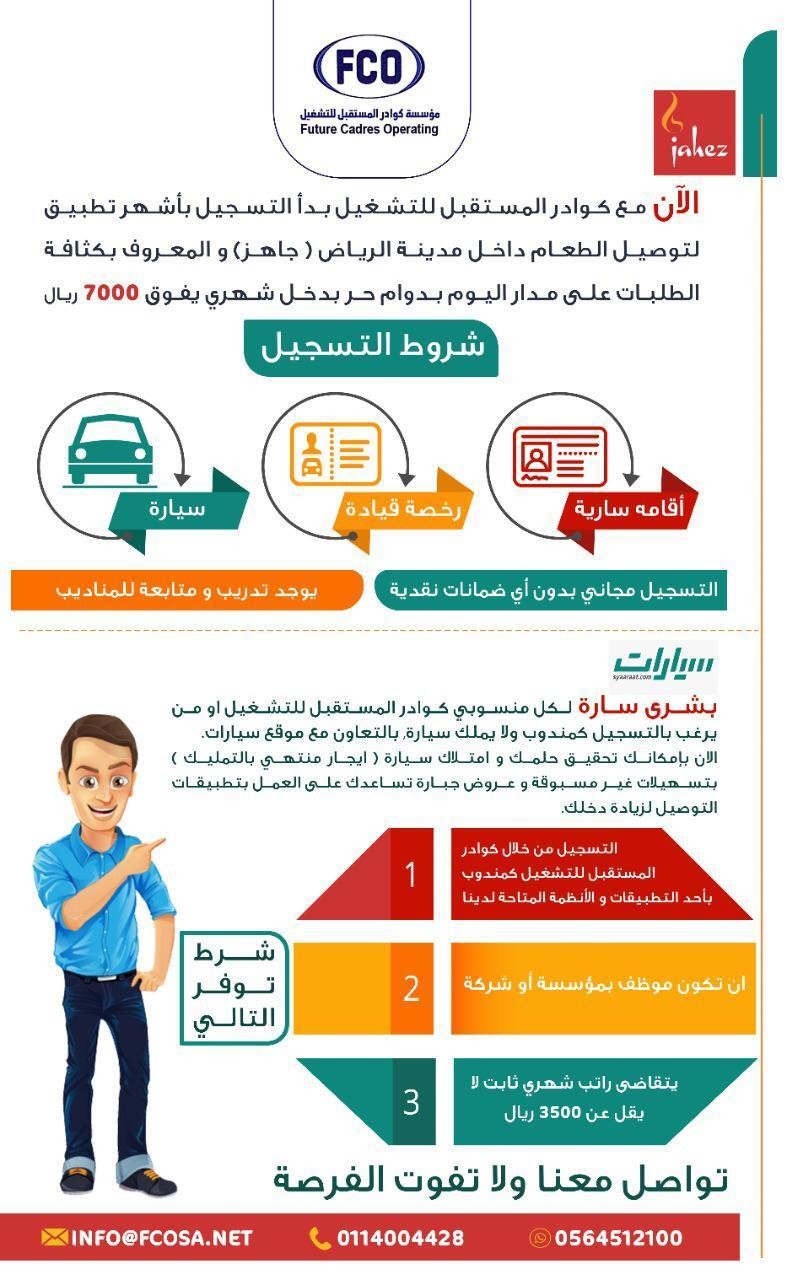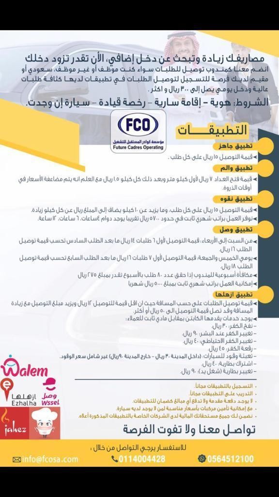 شركة كوادر المستقبل https://i.suar.me/K2vqd/l تعلن عن حاجتها الى سائقين ومندوبين للعمل في توصيل الطلبات والطرود (توصيل الطلبات مع شركة جاهز ) قيمة التوصيل ١٥ ريال والطلبات مدفوعة في المطاعم التسجيل والتدريب مجانا (توصيل الطرود) يستلم المندوب من ٥٠ الى ٧٠ طرد يوميا والتوزيع داخل حي واحد في مدينة الرياض قيمة توصيل الطلب الواحد ٩ ريال ايّام الاسبوع ويوم الجمعه ١٠ ريال الشروط إقامة رخصه استمارة السياره صورة الجواز سيارة أوقات العمل: من الساعة : ٩ صباحا إلى ٥ العصر الدور الثاني مكتب ١١ حي العقيق شارع التحلية الأشخاص الذين لايوجد لديهم سيارات🚗 هنا أرقام مكاتب للإيجار بأسعار مناسبة أرقام مكاتب إيجار السيارات: ٠٥٥٢٢٩٨٨٦٨ أبو وائل ٠٥٠٨٢٢٤٥٥٣ بهاء ٠٥٤٠٦٧٧٩٠١ خالد الخريجي ٠٥٤٤٦٩٦٠١٧ محمد ٠٥٦٢٤٢٨٠٦٩ للتواصل أرجو الاتصال على رقم الهاتف الثابت أو الجوال المذكور في الإعلان بالتوفيق للجميع https://i.suar.me/BXvmO/l |