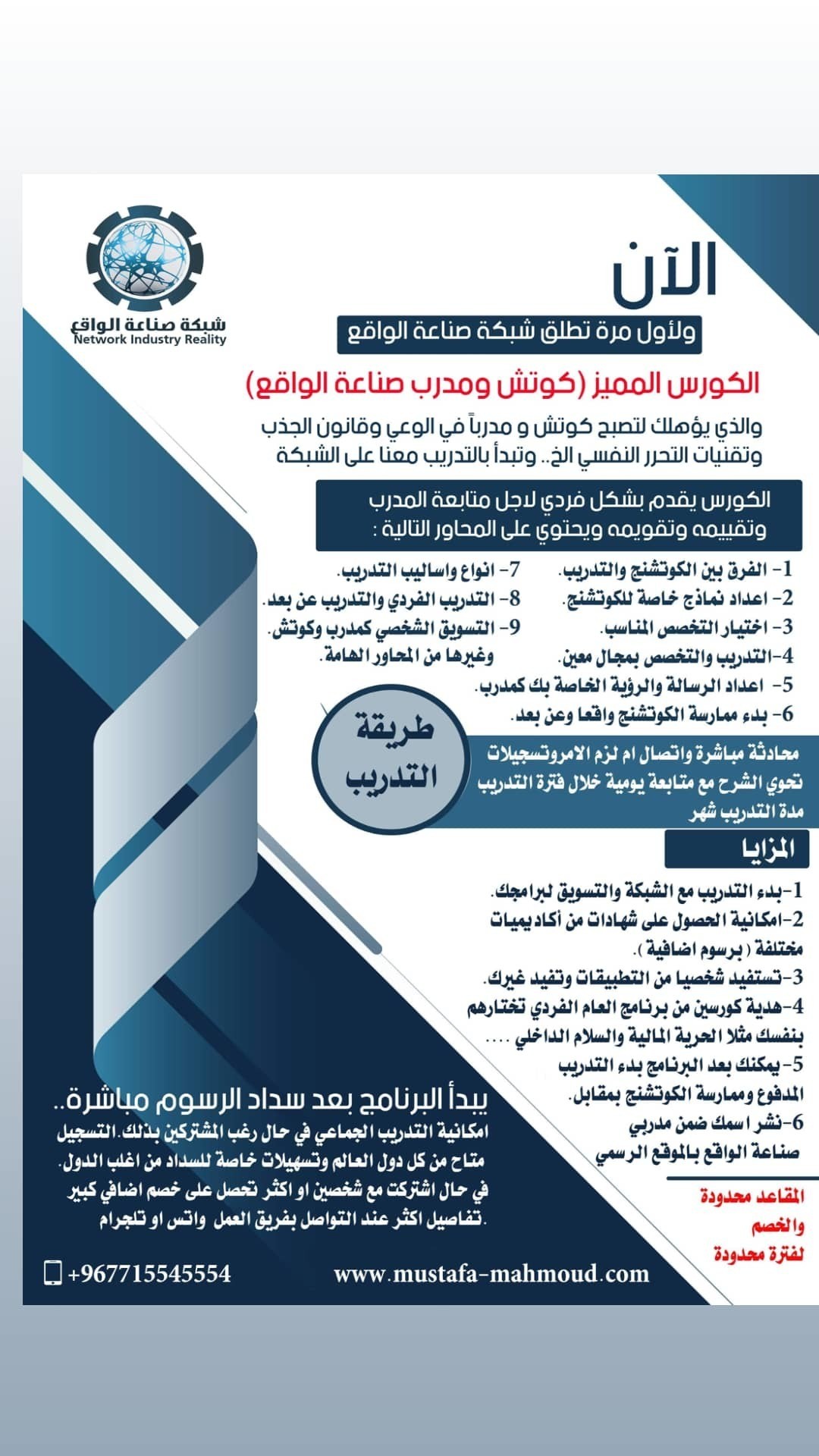 برنامج المرشد الخاص لمدة عام كامل https://i.suar.me/xKNwV/l وهدية مجانية كورس كوتش ومدرب صناعة الواقع الذي تصبح بعده مدرب وكوتش مع شبكة صناعة الواقع وايضا في بلادك وعن بعد اونلاين. ماهو برنامج العام الفردي؟ البرنامج الذي سوف تتعلم فيه(باسلوب التدريب الفردي الكوتشنج بينك وبين الكوتش فقط عن بعد من اي مكان وباي وقت مناسب لك) العديد من الأسرار الإلهية والقوانين الربانية والمهارات الحياتية التي تختصر لك الطرق وتصل بك إلى أعلى درجات النعيم والسلام والتنوير بداية بالرسالة والرؤية وطرق صياغة وتحقيق الاهداف الى اتقان فن العيش وصناعة الواقع علما انه يمكنم بدء التدريب معنا في الشبكة خلال البرنامج وبعد التخرج اذا من اهدافك التدريب ومساعدة الاخرين علما انه سوف يتم التطبيق خلال رحلة البرنامج على اكثر من ١٠٠ هدف خاص بك.. https://i.suar.me/7AX6j/l محتوى البرنامج: جلسة اكتشاف الذات. الجلسات الفردية لجذب هدف محدد. كورس شريك الحياة جزئين. كورس القوانين الربانية التي تسير الكون. كورس نعمة الامتنان. كورس الحرية المالية جزئين. كورس تقنيات التحرر النفسي. كورس السلام الداخلي. كورس الجذب التلقائي https://i.suar.me/wve74/l مدة البرنامج عامل كامل حسب الاوقات المناسبة للمتدرب وخيارات مفتوحة. الرسوم مخفضة ٥٠٪ لا تساوي قيمة جلسة كوتشنج واحدة فاغتنم الفرصة وارسل اسمك والدولة لفريق العمل للحصول على الخصم وطريقة الاشتراك. المدرب مصطفى محمود في سطور. ممارس كوتشنج معتمد من المركز الاوروبي للكوتشنج. اختصاصي كوتشنج معتمد من مدرسة البورد العربي للكوتشنج. عضو مؤسس جمعية الكوتشنج اليمنية. مدرب معتمد من البورد العربي للتدريب والاستشارات والتنمية البشرية. مدرب معتمد من مؤسسة صناع القرار للتنمية البشرية. مدرب متخصص في قانون الجذب وتقنيات التحرر النفسي. تفاصيل ومعلومات اكثر عند التواصل او زيارة الموقع الرسمي للاطلاع على السيرة الذاتية كاملة وكذلك قصص واراء المشتركين ببعض كورساتنا. يبدأ البرنامج بعد سداد الرسوم مباشرة. للتسجيل والاستفسار يرجى التواصل بفريق العمل تلجرام T.me/thesecret2018 واتساب +967715545554 المقاعد جداااا محدودة. |