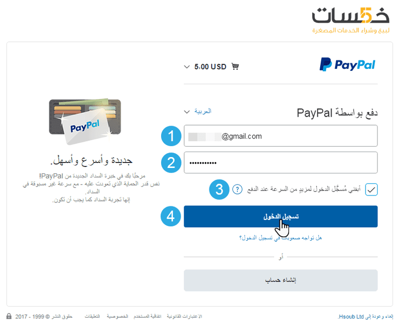 للشراء عبر حساب باي بال قم بالنقر على زر "PayPal"، بعدها سوف يتم إعادة توجيهك إلى صفحة تسجيل الدخول إلى حسابك في بايبال لإتمام عملية الدفع والشراء: