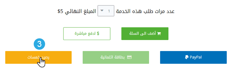 للدفع عبر البطاقة الائتمانية لا يجب أنّ يقل ثمن الخدمة عن 20$، وقبل النقر على زر الدفع الخاص بالبطاقة تأكد من زيادة (عدد مرات طلب هذه الخدمة إلى الرقم 4)، كما هو موضح بالصورة التالية: بعد النقر على زر الدفع عبر البطاقة الائتمانية تأكد من كتابة المعلومات الخاصة ببطاقتك الائتمانية في النافذة المنبثقة بشكل صحيح:
