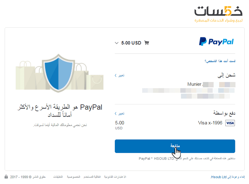 بعد تسجيل الدخول إلى الحساب سوف يتم إعادة توجيهك لصفحة إعادة مراجعة معلومات الشراء. لإتمام عملية الشراء قم بالنقر على زر متابعة. بعد النقر على زر متابعة سوف يتم إعادة توجيهك بشكل تلقائي إلى صفحة الطلب "https://khamsat.com/purchase/OrderID"، وستتوصل برسالة إلكترونية في بريدك تؤكد عملية الشراء.