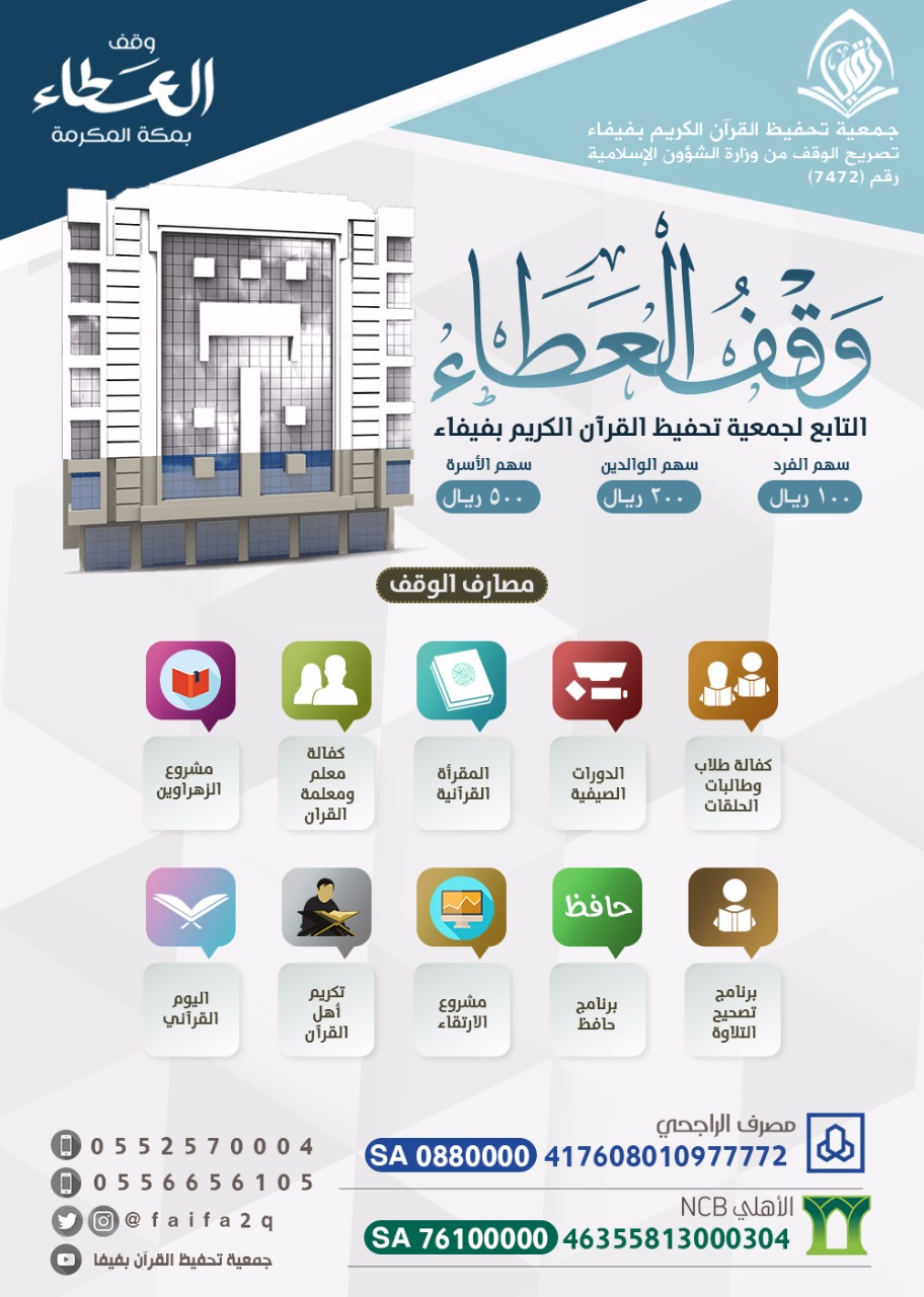 الجمعية الخيرية لتحفيظ القرآن الكريم بفيفاء اكسب الاجر من كان يسأل عن وقف مصرح ويقع بجوار بيت الله هنا https://twitter.com/Faifa2Q/status/9...497344000?s=08 *وقف العطاء بمكة المكرمة * ☑ التابع لجمعية تحفيظ القران الكريم بفيفاء 1- يقع في اطهر بقاع الأرض 2- مكة المكرمة داخل حدود الحرم 3- الحسنة فيها بمئة الف حسنه 4- يصرف دخله على تعليم وحفظ كتاب الله 5- مصرح من وزارة الشؤون الاسلاميه برقم(٧٤٧٢) 6- زكاه نخبة من العلماء والمشايخ https://goo.gl/ma8pkk ○○○○○○○○○○○○○ اغتنم شرف المكان وساهم في خير الأعمال تعليم القران فخيركم من تعلم القران وعلمه ▫▫▫▫▫▫▫▫▫ سهم الفرد 100 ريال سهم الوالدين 200 ريال سهم الاسره 500 ريال ********** للمساهمة في الوقف▫ عبر الايبان مصرف الراجحي SA0880000 417608010977772 البنك الأهلي 46355813000304 بنك البلاد 999126263030015 بنك الإنماء 68240404040001 ➖➖➖➖➖➖➖➖➖ للتواصل والاستفسار 0552570004 0556656105 تويتر - استقرام faifa2q @ اليوتيوب جمعية تحفيظ القران بفيفا للتواصل المباشر مع اداره الوقف : https://api.whatsapp.com/send? phone=966552570004 https://up.arabia2.com/do.php?img=43997 |