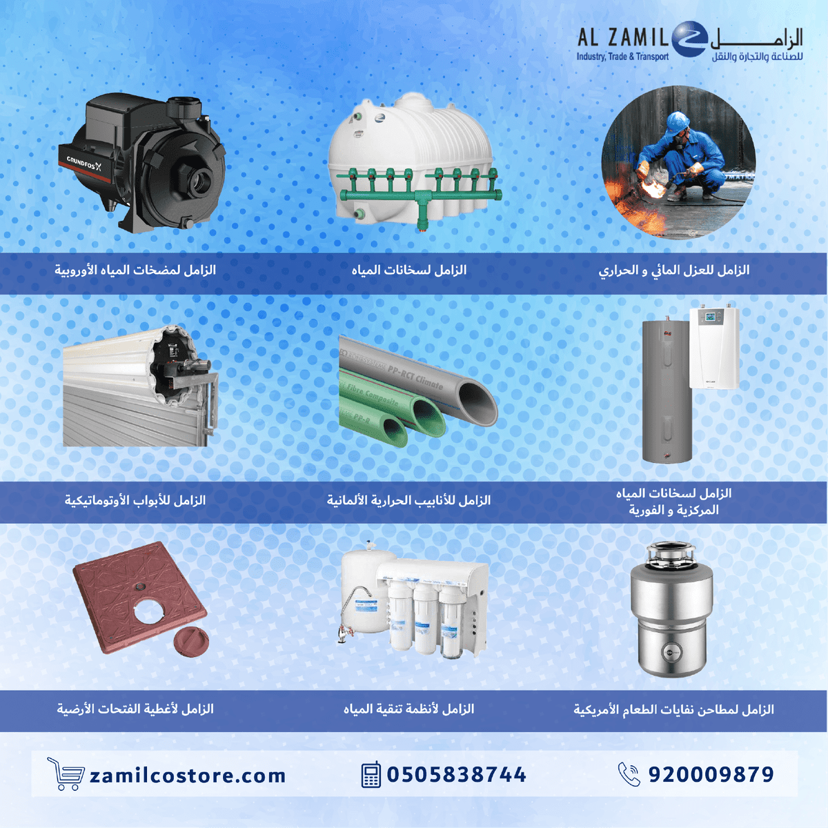 الزامل لحلول المياه المتكاملة ----------------- #الزامل_لبيت_متكامل تعمل شركة الزامل للصناعة والتجارة والنقل برؤية مستقبلية لتكون إحدى الشركات الرائدة في السوق السعودي والتي تقدم حلولا شاملة ومتكاملة لقطاع الإسكان خصوصا والقطاع التجاري عموماً، وذلك من خلال الشراكة مع شركات عالمية لتقديم حزمة من المنتجات والأنظمة الحديثة والصديقة للبيئة والتي تشمل: • مضخات المياه • أنابيب البولي بروبلين الخضراء • محطات تحلية المياه المنزلية • مطاحن نفايات الطعام المنزلية • سخانات المياه المركزية والفورية • أنظمة القواطع والأبواب • الأجهزة الامنية والاتصال المرئي وهذا بالتكامل مع صناعاتها الوطنية الراسخة عالية الجودة لـ : • خزانات الماء • أبواب الكراج • أنظمة العزا المائي والحراري • أغطية فتحات المناهل والخزانات الأرضية https://www.youtube.com/watch?v=SyQ5JlzYEqA -------------------------------- للتواصل: 920009879 - 0505838744 شاهد العروض على الرابط: www.zamilcostore.com https://i.suar.me/yqgEe/l |
