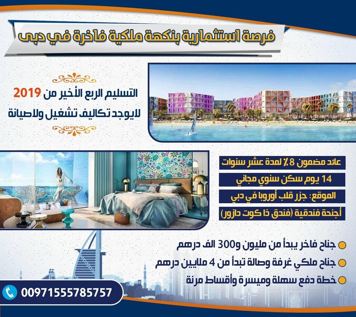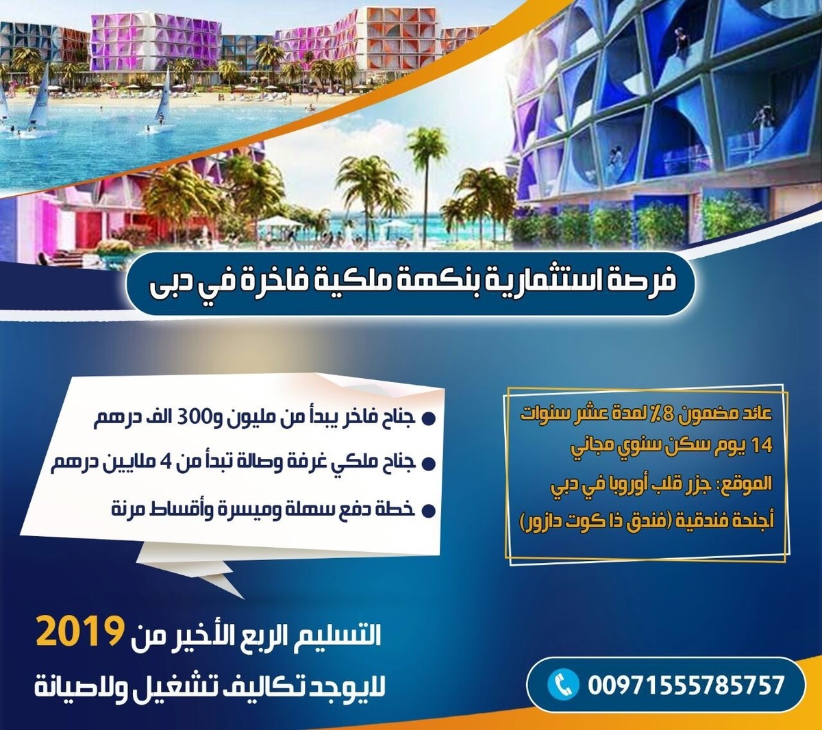 تملك عقار فاخر في مشروع جزر العالم ( جزر قلب أوروبا ) في دبي من شركة قلب أوروبا للتطوير العقاري وبالتقسيط المريح https://i.suar.me/vK7Bo/l The Heart of Europe للاستعلام والاتصال او واتس اب : 00971555785757 عائد مضمون 10% سنوي لمده 10 سنوات ، لا توجد مصروفات صيانه او تشغيل او عمولات فندق بإداره فرنسيه ، إستلام 2019 ، بأقساط ميسره 50% علي سنتين فتره الانشاء و 50% عند الاستلام ، أسعار تبدأ من مليون و 400 ألف درهم فقط لمحه عن المشروع: مشروع جزر العالم دبي يحتوى علي ٣٠٠ جزيرة صناعية علي بعد ٤.٥ كم من ساحل شاطيء برج العرب جميرا بدبي . تقوم الشركة بتطوير جزر قلب أوروبا علي ٦ جزر رئيسية من جزر العالم وهم كالتالي:- الجزيرة السويدية ، الجزيرة الألمانية ، الجزيرة السويسرية ، جزيرة موناكو ، جزيرة سانت بيتر سبيرج ، جزيرة أوروبا الرئيسية كل جزيرة من هذه الجزر تحتوى علي خاصية فريدة من نوعها لأول مرة بالعالم ومن أبرزها :- - التحكم في المناخ حتي ٢٧ درجة مئوية علي مدار العام وذلك علي بعض الجزر - فلل عائمة بغرف نوم تحت المياه حولها الأسماك والشعاب المرجانية والمعروفه بإسم فرس البحر - تساقط للثلج الصناعي علي الجزيرة السويسرية ، - فلل شاطئية تمتلك فيها الشاطيء الرملي - يوجد حساب ضمان (Escrow Account) يقوم العميل بايداع كافه المبالغ (الدفعات المقدمة والأقساط) فيه وهو حساب تحت رقابة واشراف دائرة الاراضي والأملاك في دبي . - التسليم ٢٠١٩ - شخصيات بارزة علي الصعيد المحلي والعالمي عملاء للمشروع العالمي - لكل وحده مشتراة يتمتع العميل بعدد ١٤ ليلة فندقية كل عام. - الملكية ملكية حرة تماما ولا تعتبر حق انتفاع او نظام مشاركة بالوقت ويتم تسليم العميل سند الملكية من دائرة الأملاك والأراضي - مشروع جزر العالم دبي هو حلم دبي القادم لمزيد من المعلومات يرجي التواصل علي الارقام للاستعلام والاتصال او واتس اب : 00971555785757 https://i.suar.me/6EeZB/l |